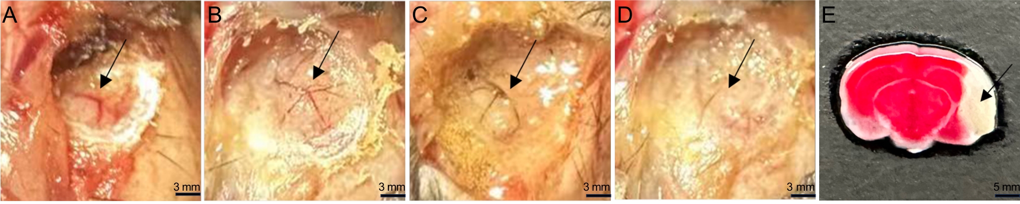Figure 2 MCA blood flow changes during MCAO model establishment and TTC staining of the cerebral infarction areaNote: A, The black arrow indicates the middle cerebral artery (MCA), which is Y-shaped; B, short-duration electrocoagulation (approximately 2-3 s), during which blood flow begins to decrease;C, continued electrocoagulation (cumulative approximately 5-6 s), with blood flow largely interrupted;D, sufficient electrocoagulation (cumulative approximately 8-10 s), resulting in complete vascular occlusion; E, 2,3,5-triphenyltetrazolium chloride (TTC) staining results of brain sections in the middle cerebral artery occlusion (MCAO) model group, the white area indicated by the black arrow is the infarcted area. The scale bar in A-D indicates 3 mm; The scale bar in E indicates 5 mm.