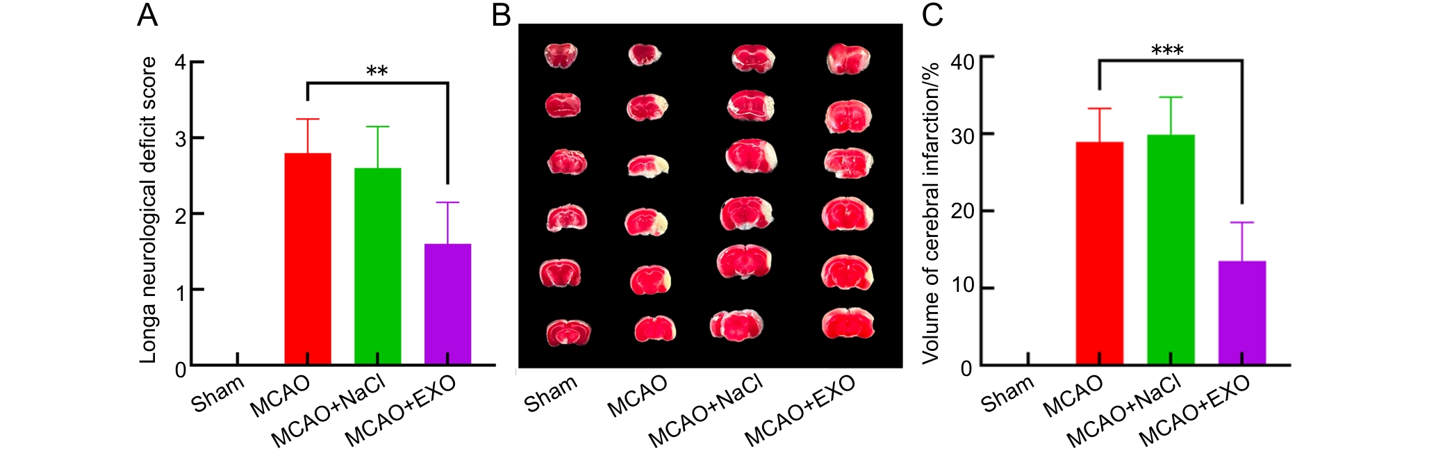 Figure 3 Analysis of neurological deficit scores and the percentages of cerebral infarction volume in each group of miceNote: A, Neurological Longa scores of each group of mice; B, 2,3,5-triphenyltetrazolium chloride (TTC) staining results of brain sections in each group of mice, each column contains six slices representing the complete brain of one mouse, normal brain tissue was red, while brain tissue in the infarcted area was white; C, The percentages of brain infarction volume in each group of mice. The sham operation group (Sham) only exposed the middle cerebral artery without electrocoagulation of the vessel; the model group (MCAO) used high-frequency surgical forceps to electrocoagulate the middle cerebral artery at a power of 8 W; the model + normal saline group (MCAO+NaCl) first injected 100 μL of normal saline through the tail vein, and then performed electrocoagulation modeling; the model + exosome group (MCAO+EXO) first injected 100 μL of exosomes (9.5×1011 particles per mL) from the culture supernatant of human amniotic mesenchymal stem cells (hAMSCs) through the tail vein, and then performed electrocoagulation modeling. There were eight mice in each group. ??P<0.01, ???P<0.001.