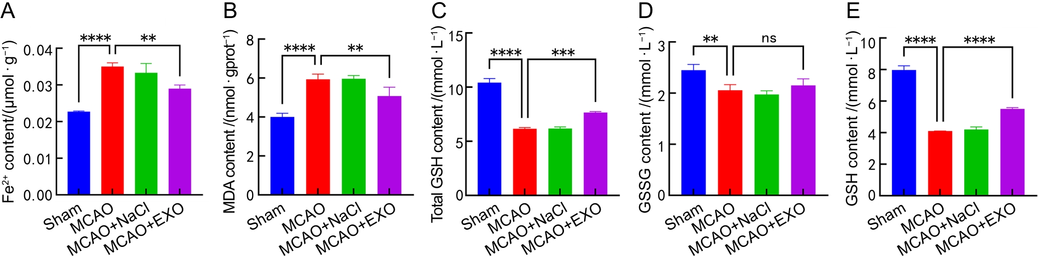 图5 各组小鼠脑组织中Fe2+、MDA、total GSH、GSSG和GSH含量的微量比色法分析结果注:A~E,各组小鼠脑组织中亚铁离子(Fe2+)、丙二醛(MDA)、总谷胱甘肽(total GSH)、氧化型谷胱甘肽(GSSG)和还原型谷胱甘肽(GSH,即total GSH和GSSG含量的差值)含量分析。假手术组(Sham)只暴露大脑中动脉,不电凝血管;模型组(MCAO)使用高频手术镊以8 W功率电凝大脑中动脉;模型+生理盐水组(MCAO+NaCl)先通过尾静脉注射100 μL生理盐水,然后进行电凝法造模;模型+外泌体组(MCAO+EXO)先通过尾静脉注射100 μL来自人羊膜间充质干细胞(hAMSCs)培养上清液的外泌体(9.5×1011个/mL),然后进行电凝法造模。每组小鼠各8只,nsP >0.05,??P<0.01,???P<0.001,????P<0.000 1。