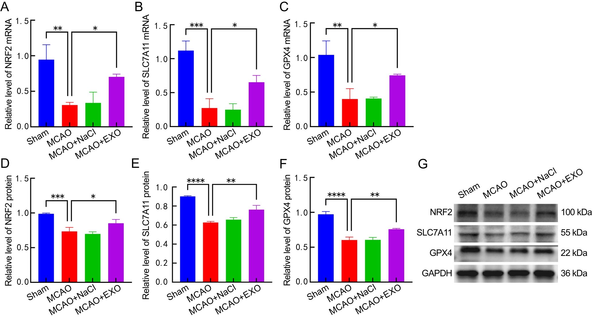 Figure 6 Detection and analysis of mRNA and protein expression of NRF2, SLC7A11 and GPX4 in the brains of each group of miceNote: A-C, mRNA transcription levels of nuclear factor-erythroid 2-related factor 2 (NRF2), solute carrier family 7 member 11 (SLC7A11), and glutathione peroxidase 4 (GPX4) in the brains of mice from each group. D-F, Relative protein expression levels of NRF2, SLC7A11, and GPX4 in the brains of mice from each group. G, Western blotting images of NRF2, SLC7A11, GPX4, and GAPDH. The sham operation group (Sham) only exposed the middle cerebral artery without electrocoagulation of the vessel; the model group (MCAO) used high-frequency surgical forceps to electrocoagulate the middle cerebral artery at a power of 8 W; the model + normal saline group (MCAO+NaCl) first injected 100 μL of normal saline through the tail vein, and then performed electrocoagulation modeling; the model + exosome group (MCAO+EXO) first injected 100 μL of exosomes (9.5×1011 particles per mL) from the culture supernatant of human amniotic mesenchymal stem cells (hAMSCs) through the tail vein, and then performed electrocoagulation modeling. There were eight mice in each group. ?P<0.05, ??P<0.01, ???P<0.001, ????P<0.000 1.