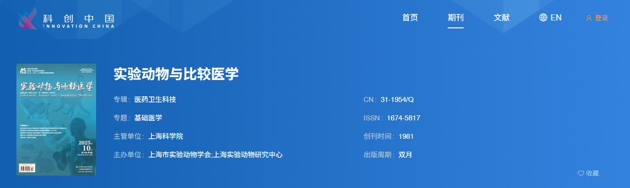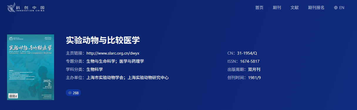 《实验动物与比较医学》(Laboratory Animal and Comparative Medicine)由上海科学院主管,上海市实验动物学会和上海实验动物研究中心联合主办。本刊系中国科技论文统计源期刊(即中国科技核心期刊),并被荷兰Scopus、美国Chemical Abstracts、美国Ulrichsweb、英国CAB Abstracts和Global Health、波兰ICI World of Journals和ICI Master List、瑞典DOAJ、WHO西太平洋地区医学索引(WPRIM)和美国EBSCO等数据库收录,同时入选中国医药卫生“核心期刊”目录。本刊是国内创刊最早的实验动物科学和比较医学专业学术期刊,欢迎各方作者积极投稿。投稿咨询QQ群:75087969。期刊官网地址:http://www.slarc.org.cn/dwyx。