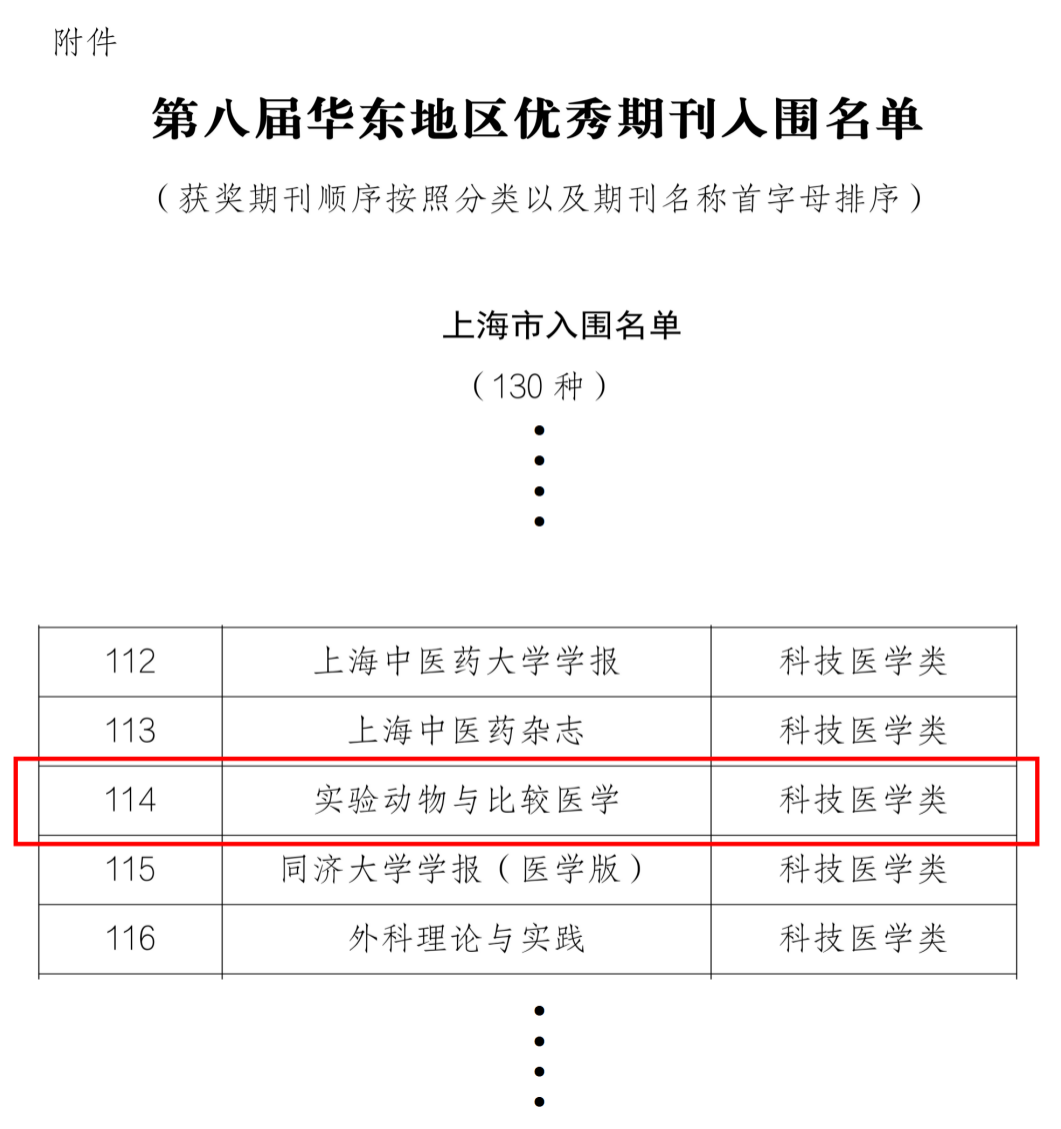 近日,第八届华东地区优秀期刊评选结果正式公布。上海实验动物学会、上海实验动物研究中心主办的《实验动物与比较医学》期刊成功入选,这也是本刊首次荣获该奖项。