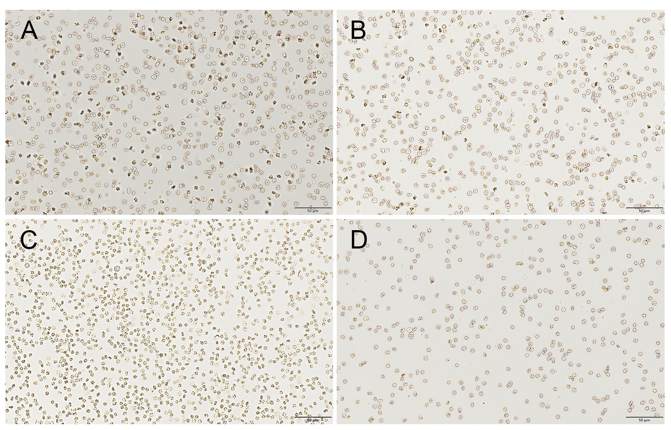 Figure 1 Cross-matching test results between donor and recipient pigsNote: A, Cross-matching results between pig R serum and pig D red blood cells; B, Cross-matching results between pig D serum and pig R red blood cells; C, Cross-matching results between pig DR1 serum and pig DR2 red blood cells; D, Cross-matching results between pig DR2 serum and pig DR1 red blood cells. Scale bar = 50 μm.