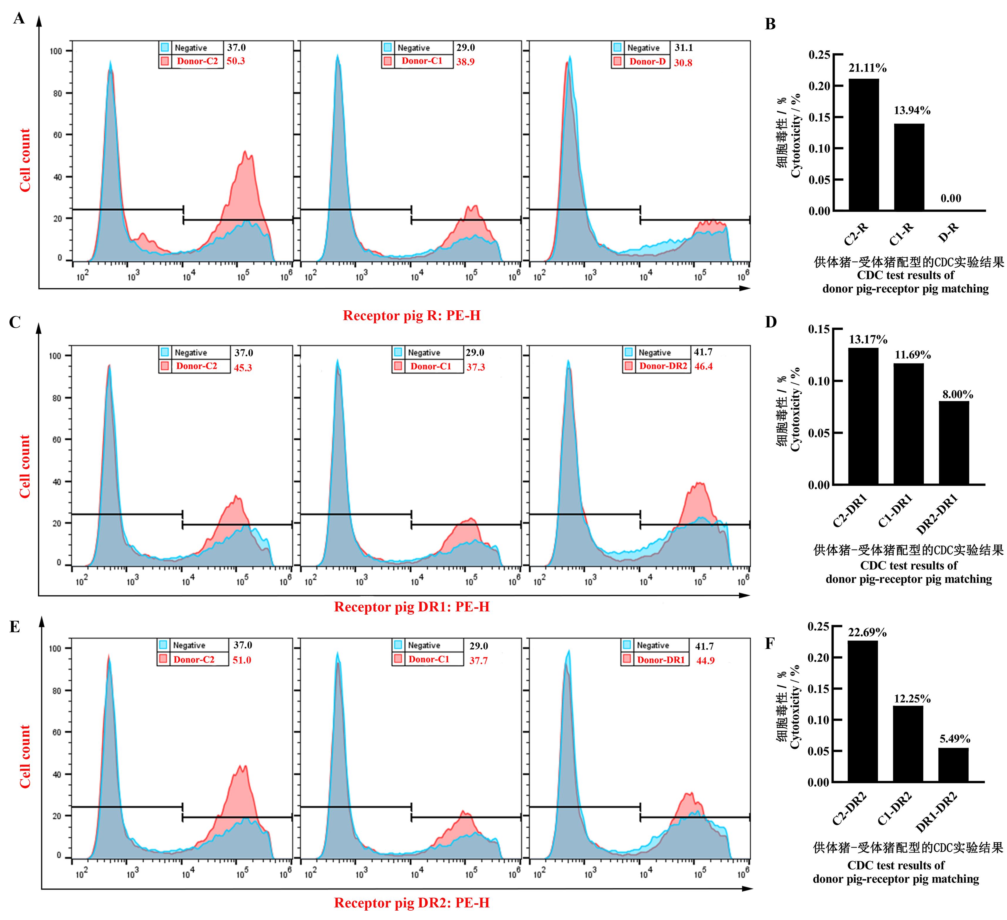 Figure 2 Results of the CDC assay between donor and recipient pigsNote: A-B, Flow cytometry results and cell death rate for the donor pig C2, C1, D versus recipient pig R in CDC matching test; C-D, Flow cytometry results and cell death rate for donor pig C2, C1, DR2 versus recipient pig DR1 in CDC matching test; E-F, Flow cytometry results and cell death rate for donor pig C2, C1, DR versus recipient pig DR2 in CDC matching test.