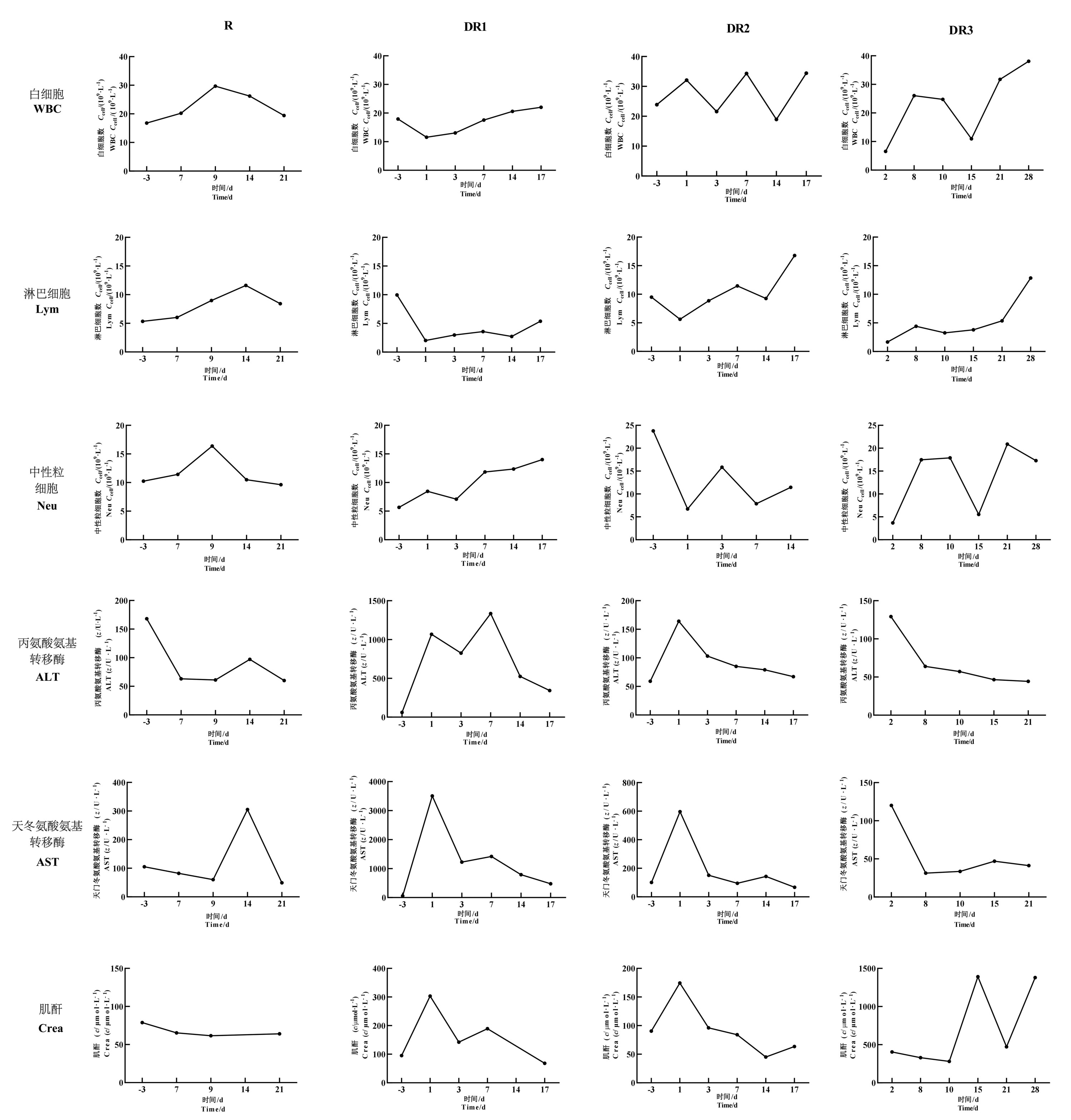 Figure 3 Routine blood, liver, and kidney function test results of donor and recipient pigs before and after kidney transplantationNote: WBC, White blood cell count; Lym, Lymphocyte count; Neu, Neutrophil count; ALT, Alanine aminotransferase; AST, Aspartate aminotransferase; Crea, Creatinine. Blood collection in pigs is difficult and may cause stress and detection errors, leading to missing data at certain time points.