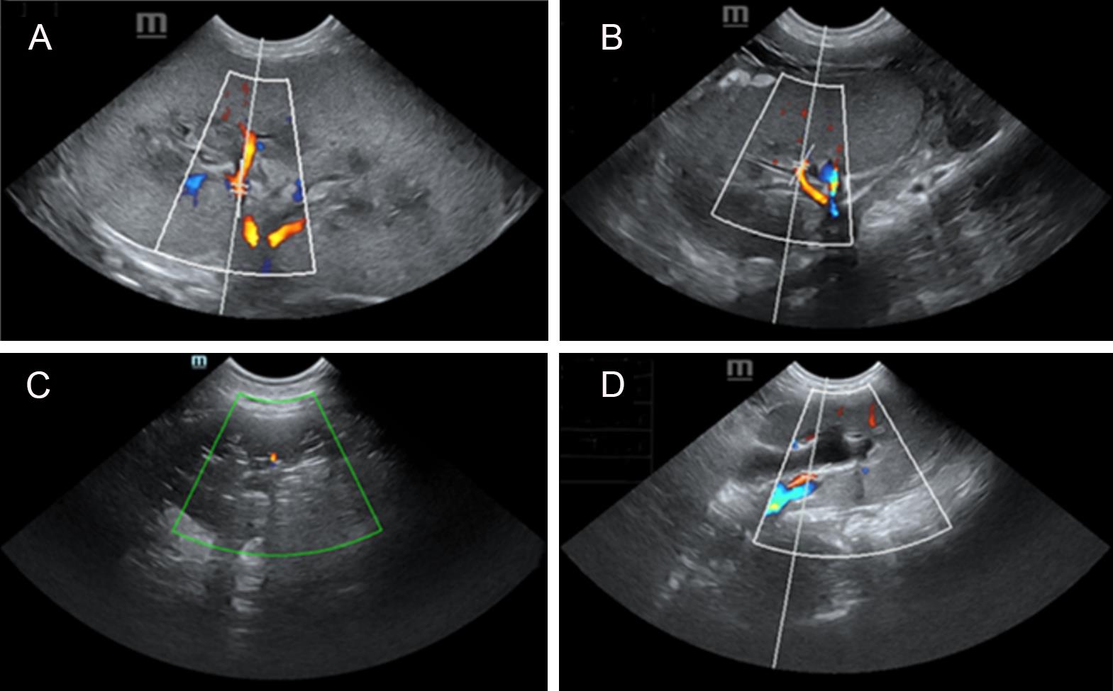 Figure 4 Renal blood flow monitoring of donor and recipient pigsNote: A, Preoperative ultrasound image of pig R; B, Postoperative ultrasound image of pig R at 24 days; C, Postoperative ultrasound image of pig DR1 at 17 days; D, Postoperative ultrasound image of pig DR2 at 17 days.