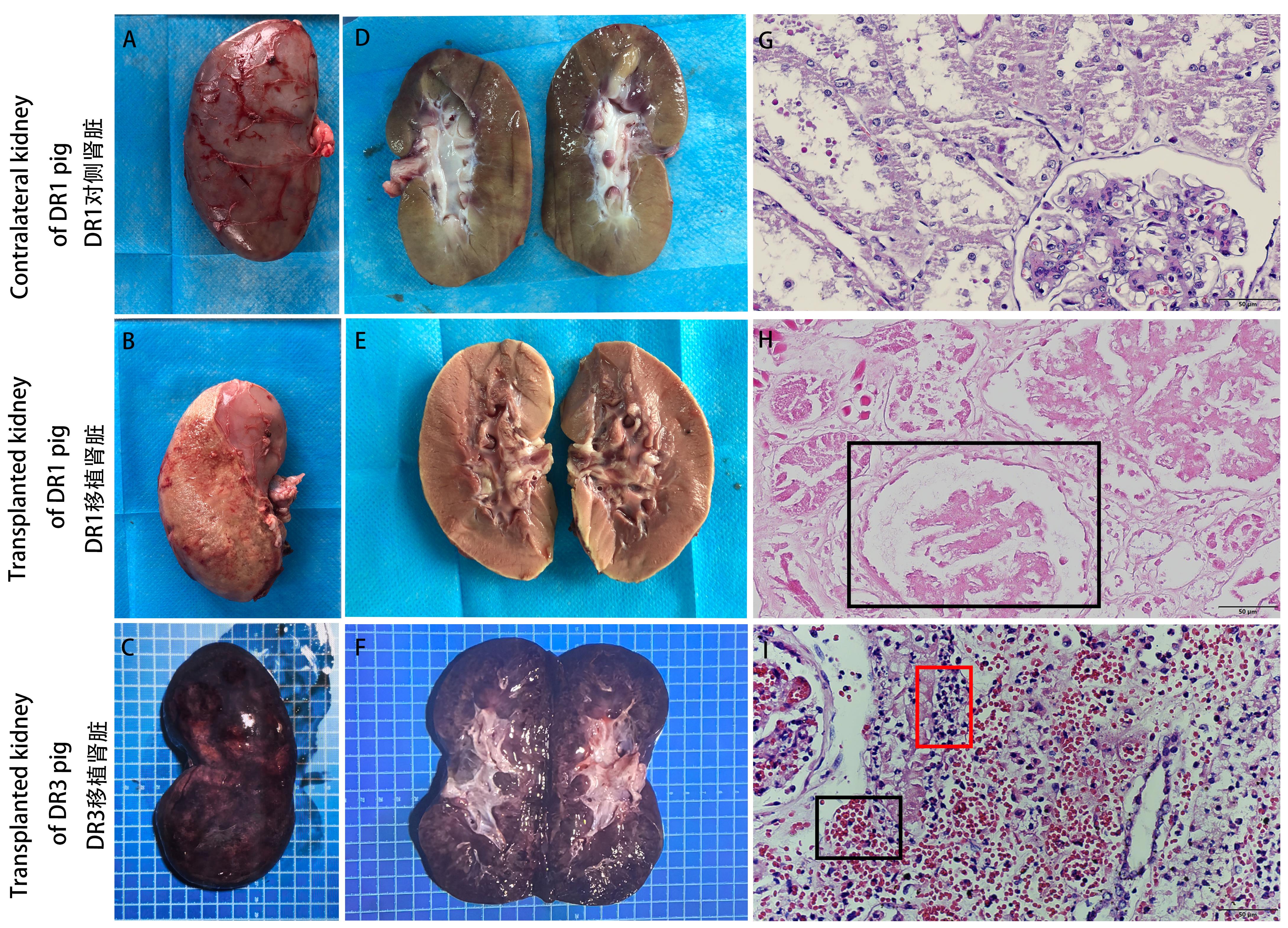 Figure 5 Gross observation and HE staining of transplanted kidneyNote: A-C, Gross appearance of the non-transplanted kidney (contralateral kidney) of pig DR1, transplanted kidney of pig DR1, and transplanted kidney of pig DR3, respectively; D-F, Sectional views of the non-transplanted kidney (contralateral kidney) of pig DR1, transplanted kidney of pig DR1, and transplanted kidney of pig DR3, respectively; G, HE staining of the non-transplanted kidney (contralateral kidney) of pig DR1; H, HE staining of the transplanted kidney of pig DR1, with glomeruli showing nuclear dissolution indicated by black boxes; I, HE staining of the transplanted kidney of pig DR3, with lymphocytes indicated by red boxes and red blood cells indicated by black boxes. Scale bar = 50 μm.