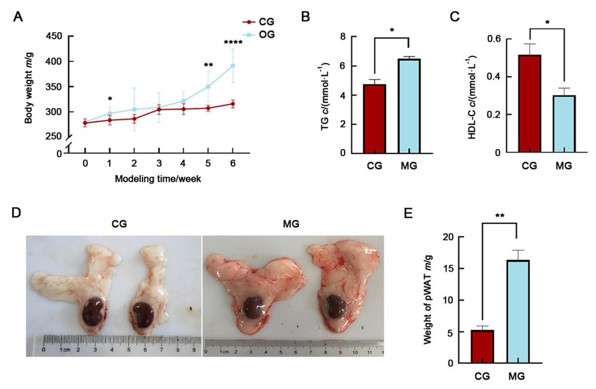 Figure 1 Simple obesity model induced by high-fat diet in ratsNote: A, Changes in body weight of rats in the control group (CG) and the obesity modeling group (OG) during the modeling process; B, Serum triglyceride (TG) levels in the control group and the model group (MG); C, Serum high-density lipoprotein cholesterol (HDL-C) levels in the control group and the model group; D-E, Perirenal white adipose tissue (pWAT)and its weight of CG and MG rats, where the D are the representative comparison figures of perirenal white adipose tissue and E represents the perirenal white adipose tissue weight of CG and MG rats. *P<0.05, **P<0.01, ****P<0.000 1.