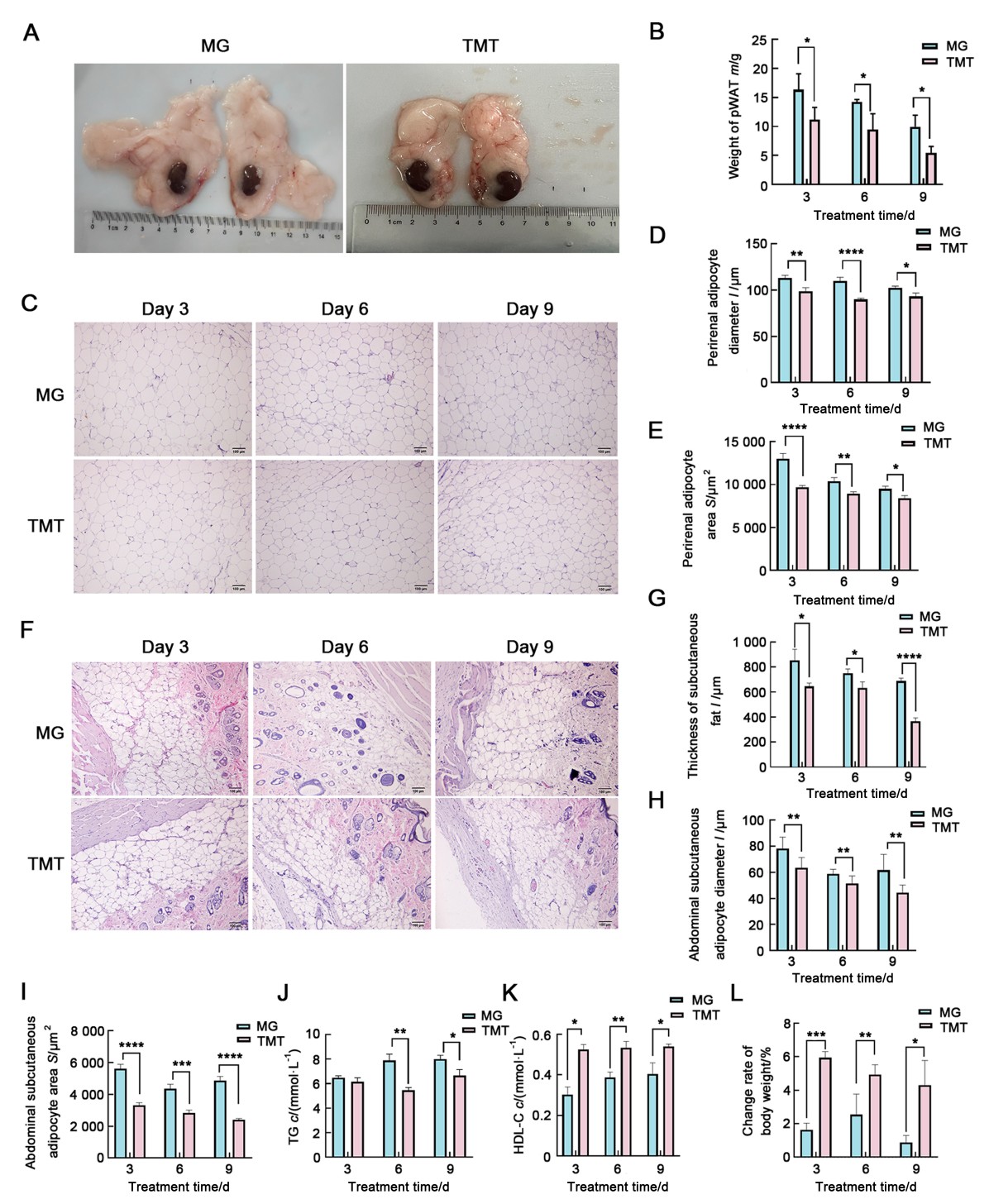 Figure 2 Anointing and massage with oligopeptide-herbal medicine composite accelerates lipid metabolism in ratsNote: A, Perirenal white adipose tissue (pWAT) of model group (MG) and treatment group (TMT) rats; B, Changes in perirenal white adipose tissue weight of model group and treatment group rats; C, HE staining of perirenal white adipose tissue of model group and treatment group rats; D, Changes in perirenal adipocyte diameter of each group; E, Changes in perirenal adipocyte area of each group; F, HE staining of abdominal subcutaneous adipose tissue (aSAT) of model group and treatment group rats; G, Changes in abdominal subcutaneous adipose tissue thickness of each group; H, Changes in abdominal subcutaneous adipocyte diameter of each group; I, Changes in abdominal subcutaneous adipocyte area of each group; J, Changes in serum triglyceride (TG) of model group and treatment group rats; K, Changes in serum high-density lipoprotein cholesterol (HDL-C) of model group and treatment group rats; L, Changes in body-weight loss rate of model group and treatment group rats. Day 3, Day 6, Day 9 represent the 3rd, 6th, 9th day of treatment, respectively; *P<0.05, **P<0.01, ***P<0.001, ****P<0.000 1. Scale bars in C and F indicate 100 μm.