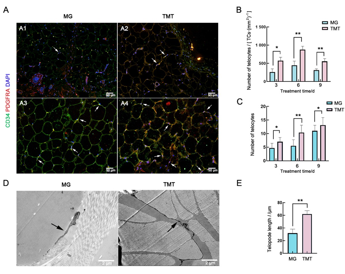 Figure 3 Effect of anointing and massage with oligopeptide-herbal medicine composite on telocytesNote: A, Immunofluorescence characterization of telocytes (TCs, indicated by the white arrows) in abdominal subcutaneous adipose tissue (A1, A2) and perirenal white adipose tissue (A3, A4) of model group (MG) and treatment group (TMT) rats; B, Changes in the number of TCs per unit area of abdominal subcutaneous adipose tissue of the model group and the treatment group; C, Changes in the number of TCs in perirenal white adipose tissue of the model group and the treatment group; D, Telopodes (Tps, indicated by the black arrows) in abdominal subcutaneous adipose tissue of the model group and the treatment group rats as shown in the transmission electron microscope images; E, Tps length of TCs in the model group and the treatment group; *P<0.05, **P<0.01; Scale bar in A indicates 50 μm and in D indicates 2 μm.