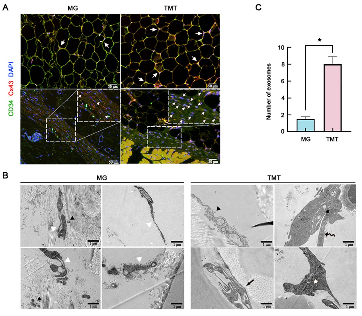 Figure 4 Effect of anointing and massage with oligopeptide-herbal medicine composite on subcellular organelles and intercellular junctions of telocytesNote: A, Immunofluorescence images show the gap junctions (indicated by white arrows) labeled with connexin 43 (Cx43) in the perirenal white adipose tissue (the first row) and the abdominal subcutaneous adipose tissue (the second row) of model group (MG) and treatment group (TMT) rats; B, Transmission electron micrographs of TCs (white triangles) and exosome vesicles (black triangles), mitochondria (black wavy arrows), cell junctions (black arrows) and rough endoplasmic reticulum (white five-pointed star); C, The number comparison of exosomes secreted by TCs in abdominal subcutaneous adipose tissue between the model and treatment groups; *P<0.05; Scale bar in A indicates 50 μm and in B indicates 1 μm.