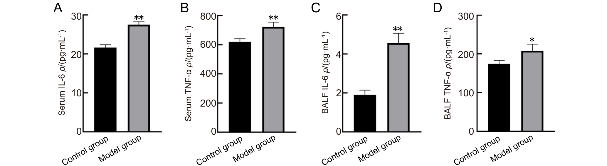 Figure 3 Comparison of IL-6 and TNF-α levels in serum and bronchoalveolar lavage fluid between the control and model groups
