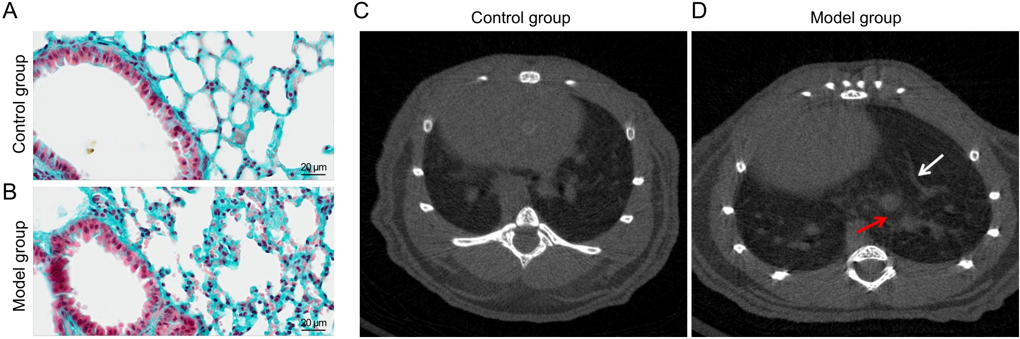 Figure 5 Comparative analysis of pulmonary collagen deposition (×400) and Micro-CT imaging of mice in the control and model groups