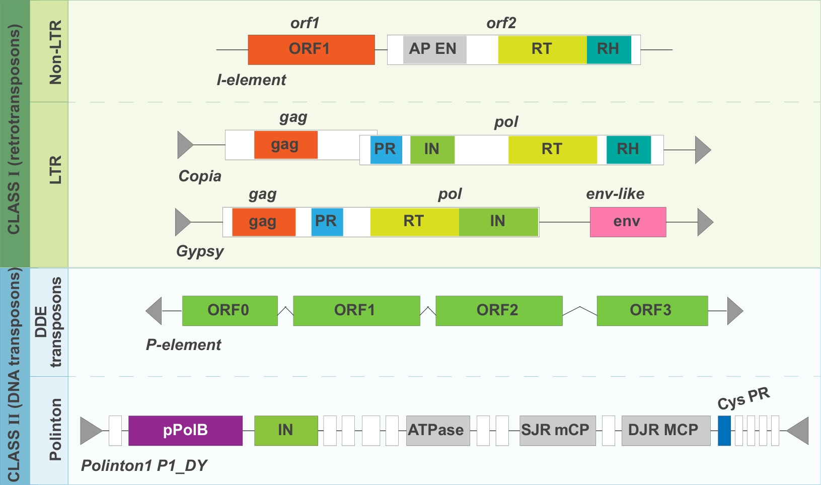 Figure 1 Examples of the structure and classification of Drosophila transposable elementsNote: Black boxes indicate open reading frames; Colored regions indicate defined protein structural domains; Folded segments indicate introns; Triangles indicate repeated sequences; Structural domains of the same color (excluding gray) share a common ancestor; AP, apurinic/apyrimidinic; ATPase, adenosine triphosphatase; Cys, cysteine; DJR MCP, double jelly-roll major capsid protein; EN, endonuclease; IN, integrase; ORF, open reading frame; pPolB, protein-primed type B DNA polymerase; PR, pol-encoded protease; RH, Ribonuclease H domain; RT, reverse transcriptase; SJR mCP, single jelly-roll minor capsid protein.