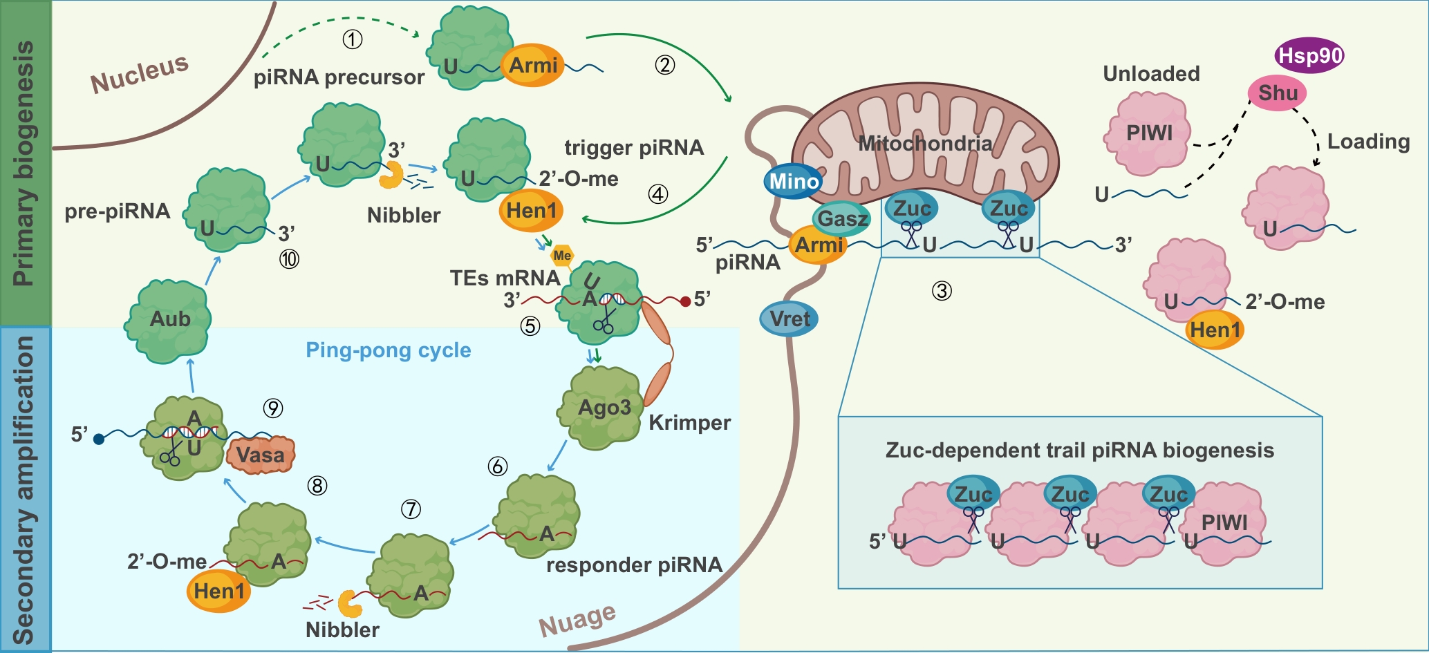 Figure 2 Schematic diagram of piRNA biogenesisNote: 2'-O-me, 2'-O-methylation; Me, methyl group; piRNA, PIWI-interacting RNA; TE, transposable element; Ago3, Argonaute 3; Armi, Armitage; Aub, Aubergine; Hsp90, Heat shock protein 90; Mino, Minotaur; Vret, Vreteno; Zuc, Zucchini; Hen1, Hen1 methyl-transferase; Vasa, Vasa DEAD-box RNA helicase; Gasz, Germline-associated scaffolding zinc finger.