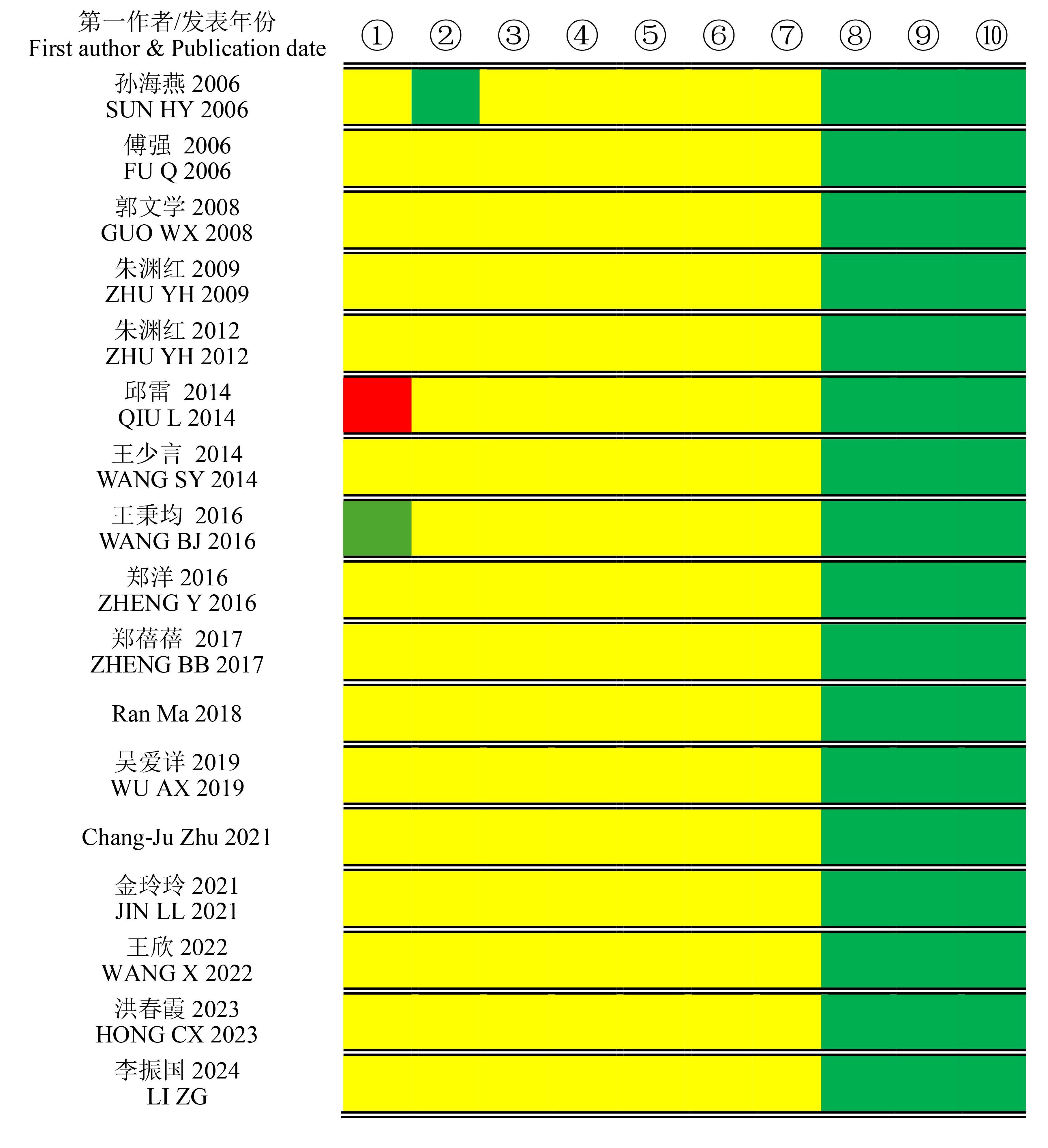 Figure 2 Risk of bias graph of SYRCLE ratings for the included studiesNote: Green, low risk; Red, high risk; Yellow, unclear risk. ① Sequence generation (randomization), ② Baseline characteristic comparability, ③ Allocation concealment, ④ Random housing, ⑤ Random feeding ⑥ Blinding (experiment), ⑦ Random outcome assessment, ⑧ Incomplete data reporting, ⑨ Selective outcome reporting, ⑩ Other sources of bias.