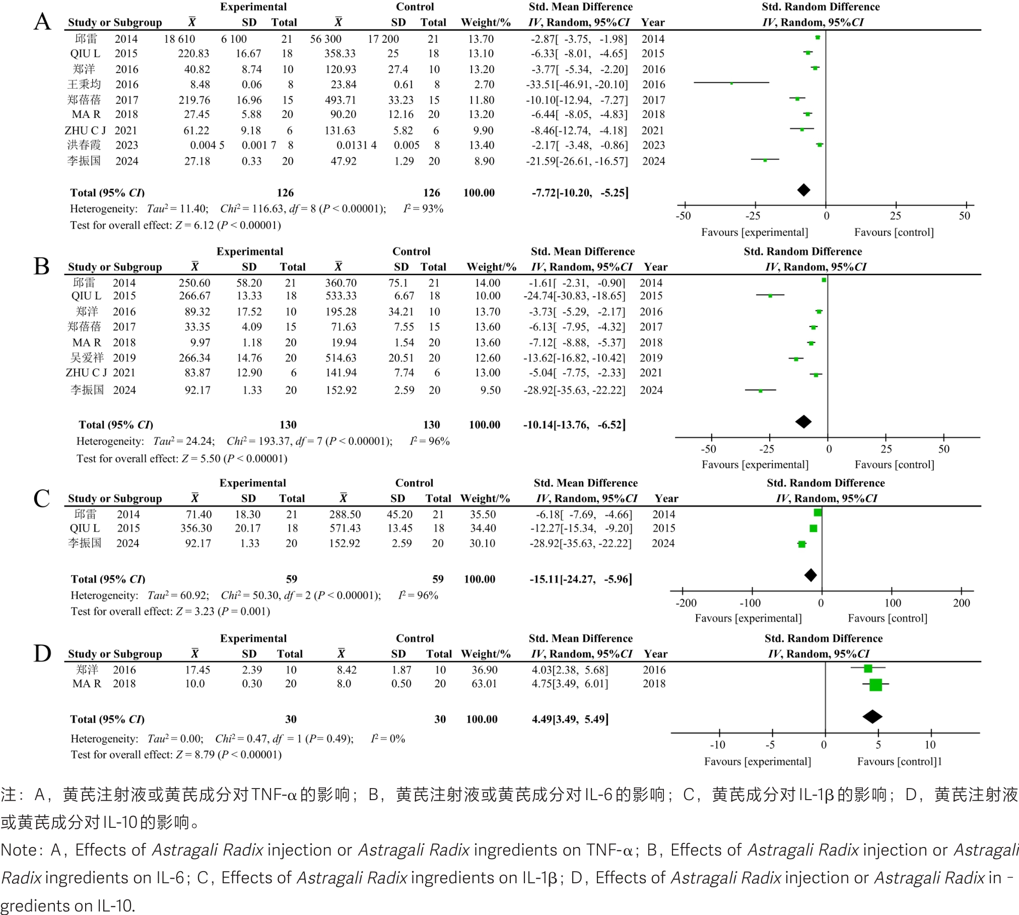 Figure 4 Forest plot of the meta-analysis on inflammatory mediator in experimental animals with acute pancreatitis after treatment with Astragali Radix or its ingredients.