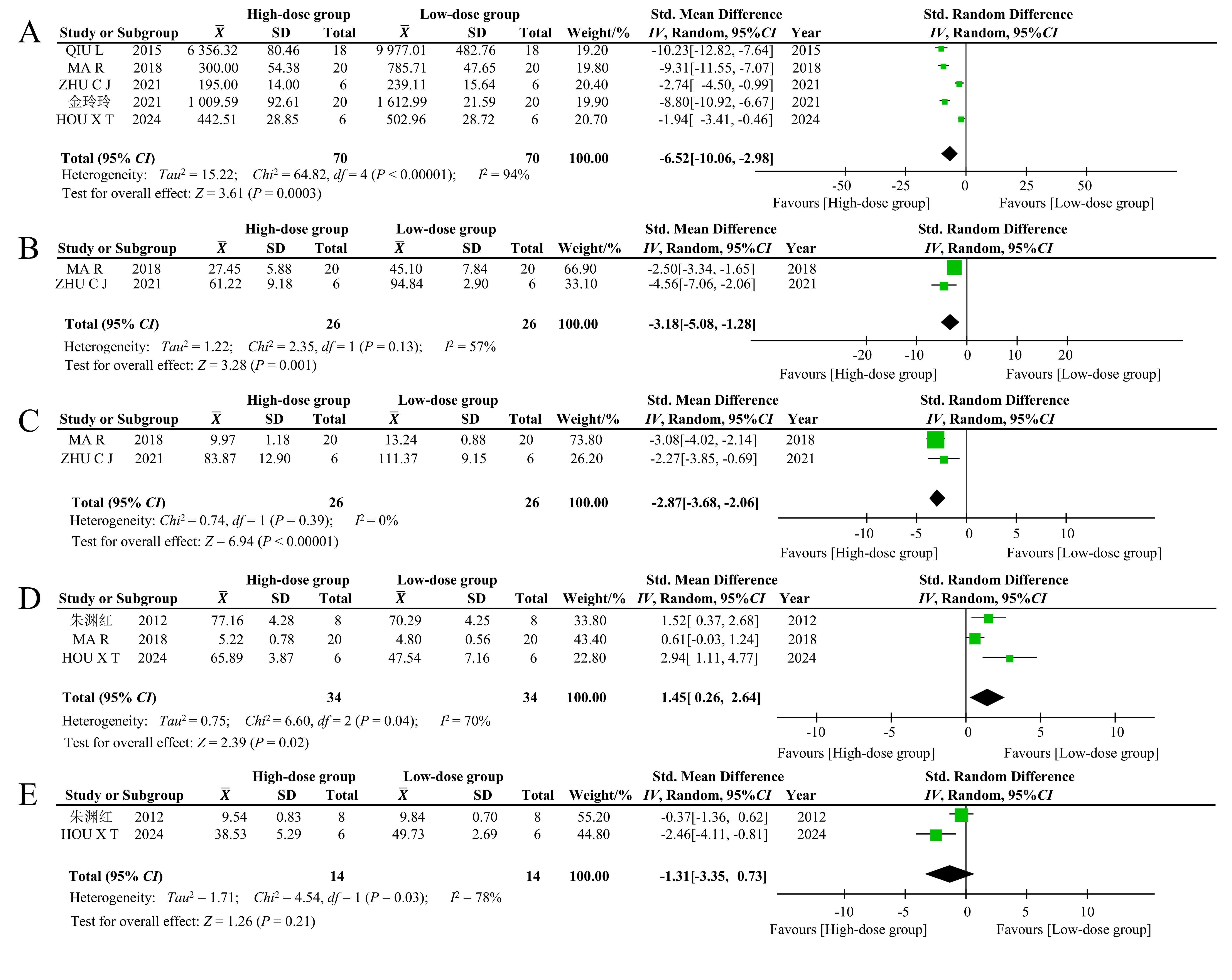 Figure 6 Forest plot of a Meta-analysis on clinicopathological indicators in experimental animals after treatment of acute pancreatitis with different doses of Astragali Radix injection or Astragali Radix ingredientsNote: A, Effects of different doses of Astragali Radix injection or Astragali Radix ingredients on serum amylase (AMS); B, Effects of different doses of Astragali Radix injection or Astragali Radix ingredients on TNF-α; C, Effects of different doses of Astragali Radix injection or Astragali Radix ingredients on IL-6; D, Effects of different doses of Astragali Radix injection or Astragali Radix ingredients on superoxide dismutase (SOD); E, Effects of different doses ofAstragali Radix injection or Astragali Radix ingredients on malondialdehyde (MDA)