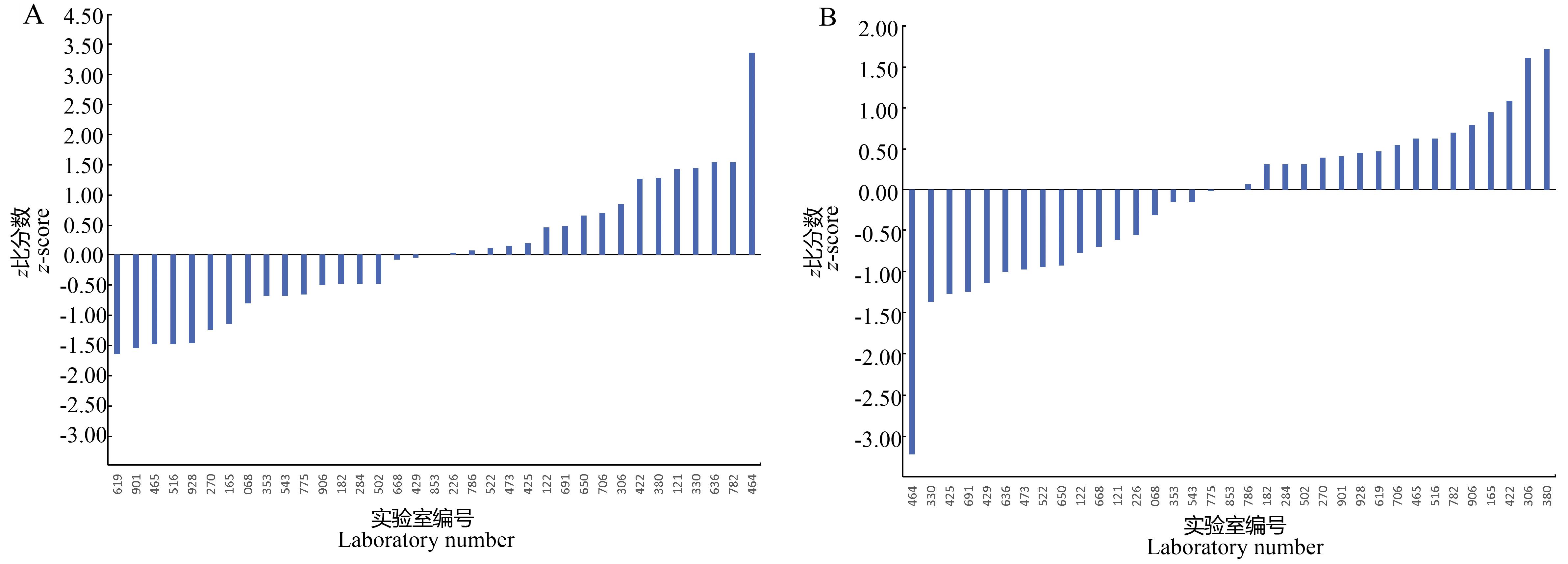Figure 2 The inter-laboratory and intra-laboratory score from 35 participating laboratoriesNote: A represents the inter-laboratory score (ZB,Z represents ZB) used to evaluate the consistency of measurements among the 35 different laboratories; B represents the intra-laboratory score (ZW,Z represents ZW) used to assess the stability of measurements within the same room subjected to be tested. The numerical values are arranged from left to right in ascending order.