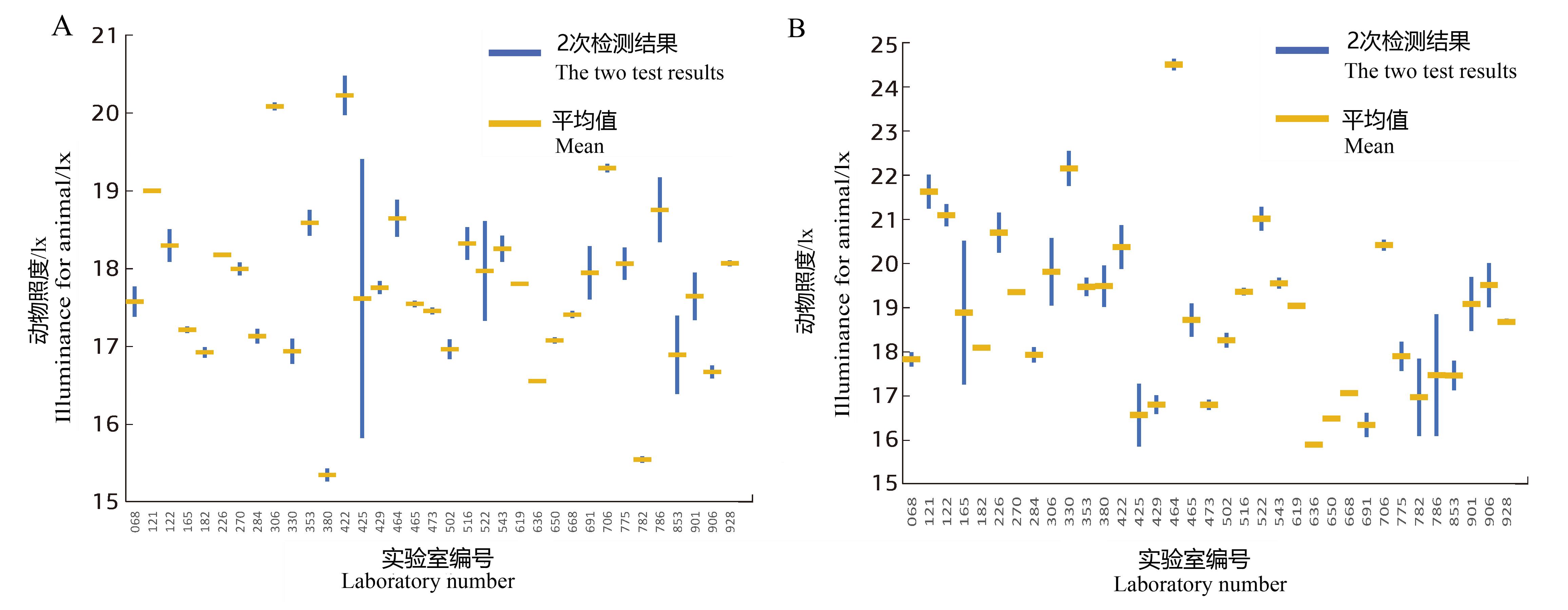 Figure 3 Deviation plots of repeated measurement results of animal illuminanceNote: A and B represent the measurement results of Room 1 and Room 2 provided by the 35 different laboratories in site.