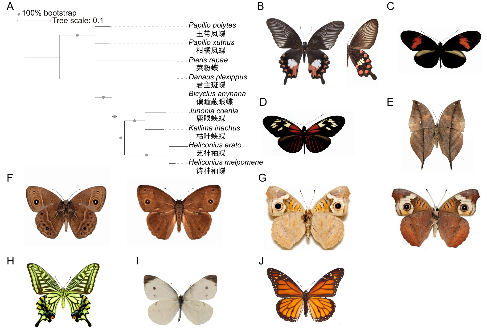Figure 1 Phylogeny and wing phenotypes of representative butterfly research taxaNote: A, Orthologous genes from nine species were identified using OrthoFinder, and a maximum likelihood phylogenetic tree was constructed based on 2 711 single-copy genes; B, Dorsal side of a mimetic female Papilio polytes, with the dorsal side of its mimetic model Pachliopta aristolochiae on the right; C, Dorsal side of Heliconius melpomene; D, Dorsal side of Heliconius erato; E, Ventral side of Kallima inachus showing its leaf-like wing pattern; F, Ventral sides of Bicyclus anynana, with the wet seasonal morph on the left and the dry seasonal morph on the right; G, Ventral sides of Junonia coenia, with the wet seasonal morph on the left and the dry seasonal morph on the right; H, Dorsal side of Papilio xuthus; I, Dorsal side of Pieris rapae; J, Dorsal side of Danaus plexippus .