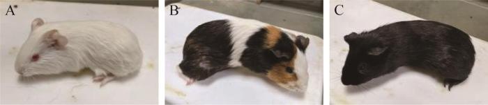 由中国医学科学院引进的白色豚鼠,与浙江大学实验动物中心原先饲养的花色豚鼠杂交,然后通过近亲繁殖11代,分离出白色、黑色和花色3种毛色群体。每个毛色群体再以封闭形式远交繁殖4代以上,最后形成3个远交群。将白色豚鼠命名为Zmu-1∶DHP品种,黑色豚鼠命名为Zmu-2∶DHP品种,花色豚鼠命名为DHP品种。本实验取Zmu-1∶DHP白色豚鼠22只,DHP花色豚鼠22只,Zmu-2∶DHP黑色豚鼠13只,体重约300~400 g,性别不论。所有动物均来自浙江宏润生物科技有限公司[SCXK(浙)2022-0010],质量合格证号为20240315Cddz0600999173。所有豚鼠毛色表型见图1。