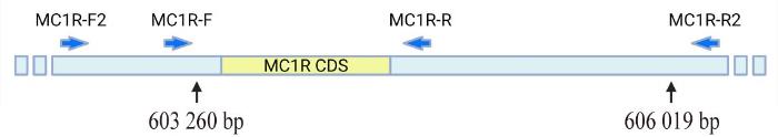 MC1R-F2 MC1R-R2 | CCCCGTGATAAACAGCACAATGG TTGTGCCTCCTTTGCTTGTGTC | 3 956 or 1 196 | 外显子Ⅰ |
