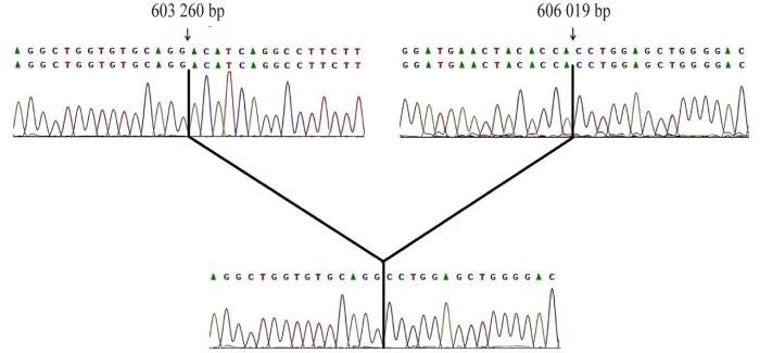 豚鼠MC1R基因外显子CDS及旁侧序列测序发现,部分个体的 MC1R基因呈现两个断裂点,分别位于第603 260 bp和606 019 bp位置,断裂点之间缺失一段DNA序列,长度为2 760 bp,其中包括CDS区域。因片段缺失而造成MC1R基因呈长度多态性,其插入序列及断裂点旁侧部分序列的峰值图见图5。