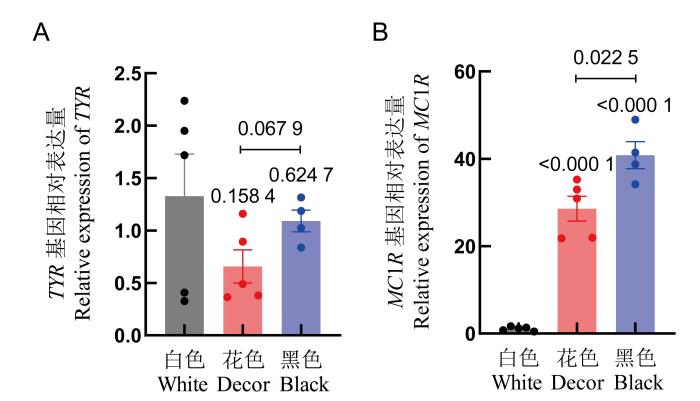 使用Chromas 2、Primer 5和DNAman 9软件进行测序结果分析;使用Cervus 3.0软件分析基因频率和基因型频率。使用SPSS 22.0软件进行统计学分析。3个毛色品种豚鼠的TYR、MC1R基因型和基因频率用百分率表示,组间比较采用卡方检验;基因表达量用平均值±标准差表示,组间比较采用单因素方差分析,组内比较采用LSD-t检验,P<0.05表示差异有统计学意义。使用GraphPad Prism 9软件制作统计图。
