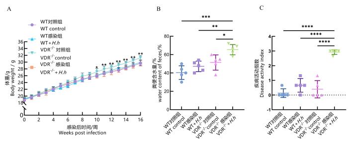 H.hepaticus感染后各组小鼠的体重变化(A)、粪便含水量(B)和疾病活动指数评分(C)比较
