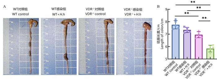 小鼠结肠长度是评估小鼠结肠炎的重要参数。在成功感染后第16周时,与WT小鼠对照组相比,WT+H.h组小鼠结肠明显缩短(P<0.01);与VDR-/-小鼠相比,VDR-/-+H.h组小鼠结肠明显缩短(P<0.01,图2)。此外,与WT小鼠对照组相比,VDR-/-小鼠对照组也出现结肠缩短(P<0.01),而VDR-/-+H.h组小鼠结肠较VDR-/-小鼠相比更短(P<0.01)。