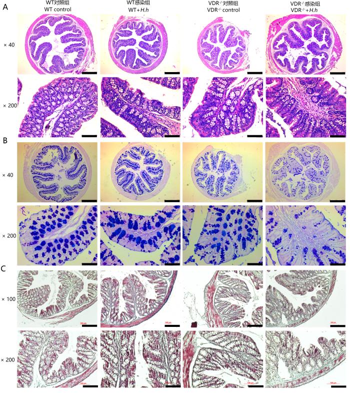 H.hepaticus 感染16周后,取各组小鼠的近端结肠组织进行病理切片染色(图4)。HE染色结果(图4A)显示,VDR-/-小鼠感染组肠道杯状细胞减少,固有层淋巴细胞聚集,隐窝淋巴细胞浸润,部分组织隐窝结构消失,隐窝内肠腺数量减少,且大小形状不规则,黏膜上皮略有增厚;而WT小鼠感染组仅出现轻微的杯状细胞缺失和淋巴细胞浸润;WT和VDR-/-小鼠对照组小鼠肠道结构正常,肠腺清晰,未见明显病变。AB-PAS染色结果(图4B)表明,VDR-/-小鼠感染组肠道杯状细胞缺失,黏液减少,而WT感染组和WT、VDR-/-小鼠对照组肠道结构正常。Masson染色结果(图4C)显示,VDR-/-小鼠感染组肠道胶原纤维增多,肠纤维化程度加重,而WT小鼠感染组胶原沉积较少,WT、VDR-/-小鼠对照组肠道无胶原沉积。综上所述,VDR缺失会促进H.hepaticus感染,引起小鼠肠炎和肠纤维化。