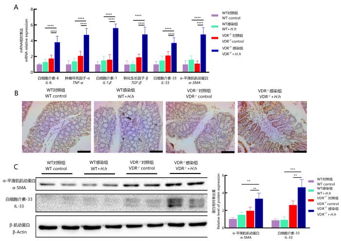为探究H.hepaticus感染引起VDR-/-小鼠肠纤维化的致病机制,对肠道组织中相关因子表达进行免疫组织化学(图5B)和蛋白质印迹(图5C)检测。α-SMA是反映胶原沉积的重要指标[13]。蛋白质印迹结果显示,VDR-/-小鼠感染组α-SMA蛋白表达水平高于WT感染组(P<0.01),这提示VDR缺乏可导致H.hepaticus促进了肠炎向肠纤维化发展。IL-33是一种多效性细胞因子,参与组织修复,包括纤维化疾病的发生、发展[14]。免疫组织化学和蛋白质印迹结果均显示,与WT小鼠感染组相比,VDR-/-小鼠感染组肠道中IL-33水平升高(P<0.001),提示VDR的缺失引起IL-33表达上调,可能是加剧肠纤维化的原因之一。
