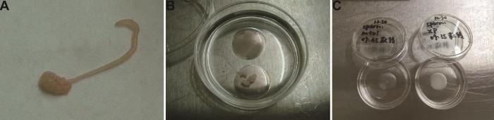 分离供体小鼠卵巢:将供体小鼠腹腔注射1.25%阿佛丁(美国Sigma-Aldrich公司,货号T48402-5G)麻醉,备皮并消毒皮肤,分层剪开腹部皮肤和腹壁肌肉层,分离出双侧卵巢并称重记录(图2B)。迅速将供体卵巢放入37 ℃预热的M2培养液(美国Sigma-Aldrich公司,货号M7167)中清洗,待移植。