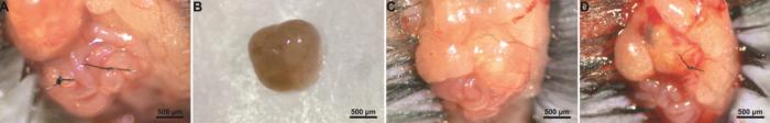 受体雌性小鼠自体对侧卵巢摘除:在受体小鼠另一侧以同样的方式固定卵巢、输卵管和子宫(图2C),在输卵管伞口对侧的卵巢囊膜上剪开一个适度大小的切口,将自体卵巢从囊膜中小心剥离出来,并用眼科角膜剪剪断卵巢蒂,摘除完整的卵巢。