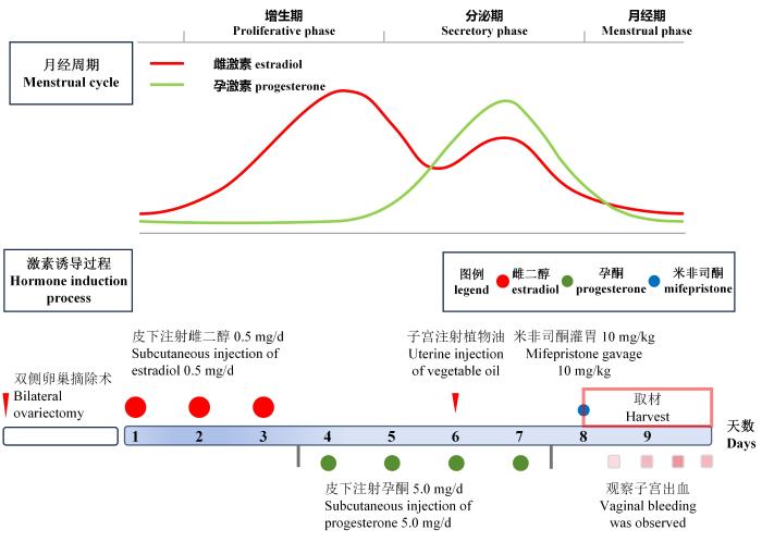 月经周期内雌孕激素水平变化示意图和异常子宫出血大鼠模型制备流程图