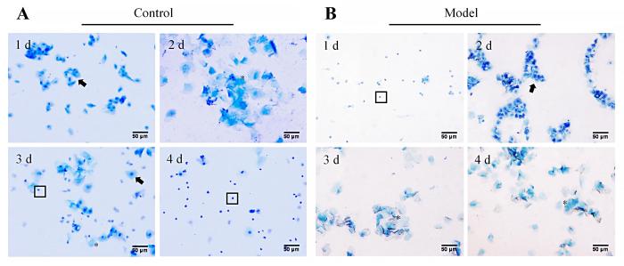 随机选取2笼模型组大鼠和2笼正常对照组大鼠,从开始造模用药到孕激素撤退,每日进行阴道脱落细胞形态学观察。取医用棉签蘸取少量生理盐水,深入大鼠阴道大约1 cm,顺时针轻柔转2圈后取出,在载玻片上顺时针滚动均匀铺开脱落细胞,用无水乙醇溶液固定后,浸入亚甲蓝溶液中染色15 min,去离子水漂洗2次,在光学显微镜下观察并记录细胞形态。