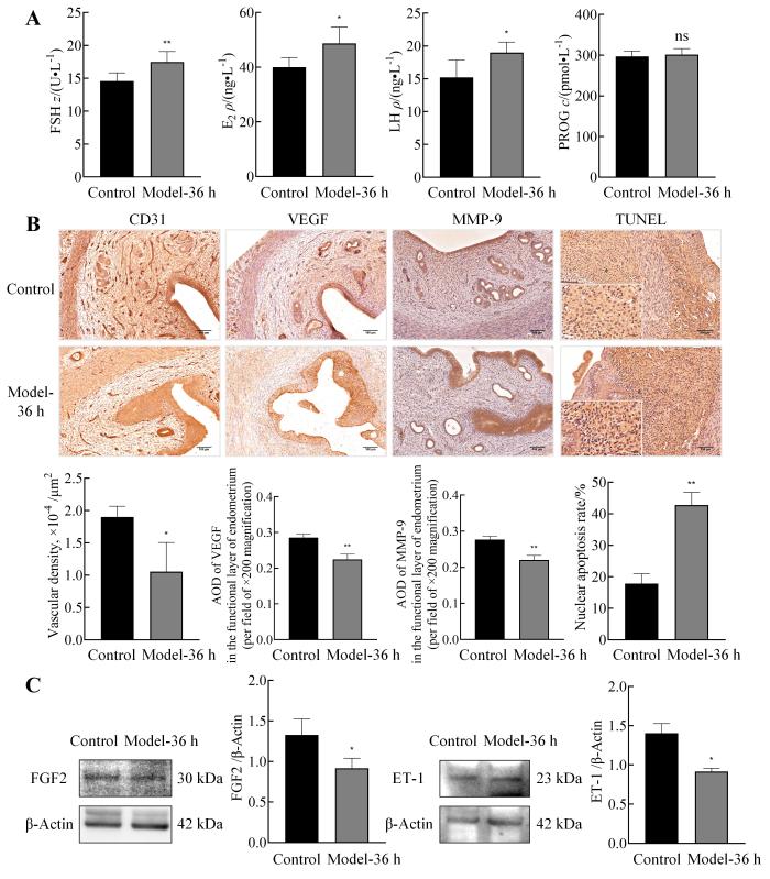 检测大鼠血清性激素水平的ELISA检测结果显示,与正常对照组相比,模型组大鼠在孕激素撤退36 h的血清中FSH、E2和LH水平明显升高(P<0.05),PROG无明显差异(P>0.05,图4A)。免疫组织化学检测结果显示,与正常对照组相比,模型组大鼠在孕激素撤退36 h时CD31标记的子宫内膜血管密度明显降低(P<0.05);VEGF在子宫内膜剥脱处表达明显增强,而在间质血管周围表达水平显著下降(P<0.01);MMP-9在子宫内膜损伤部位表达明显增强,而在未剥脱间质和腺体处表达水平显著降低(P<0.01,图4B)。TUNEL染色后观察发现,与正常对照组相比,模型组大鼠在孕激素撤退36 h时的子宫内膜间质细胞阳性率显著增加(P<0.01,图4B)。蛋白质印迹检测结果显示,与正常对照组相比,模型组大鼠在孕激素撤退36 h时的子宫组织中FGF2和ET-1的表达水平均明显下降(P<0.05,图4C)。