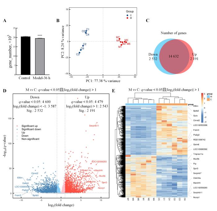 取正常对照组和模型组孕激素撤退36 h(简称Model-36 h)大鼠各6只,每只大鼠均取约100 mg的冻存子宫组织,置于干冰中,运输至上海欧易生物医学科技有限公司进行转录组学测序。测序数据经过清洗获得高质量reads后,比对到参考基因组,计算获得counts数值,得到样本检测的基因数目。计算基因的FPKM定量结果,并进行主成分分析。筛选差异表达基因时,以q-value<0.05并且|log2(fold change)|>1作为标准,绘制火山图,以展示单个基因的表达变化和显著性;绘制差异表达基因分组聚类热图,以展示基因表达模式的整体视图和样本间的聚类关系;对差异表达基因进行GO功能分析和KEGG富集分析,并根据q-value列举出显著上调的前10个基因和显著下调的前10个基因。