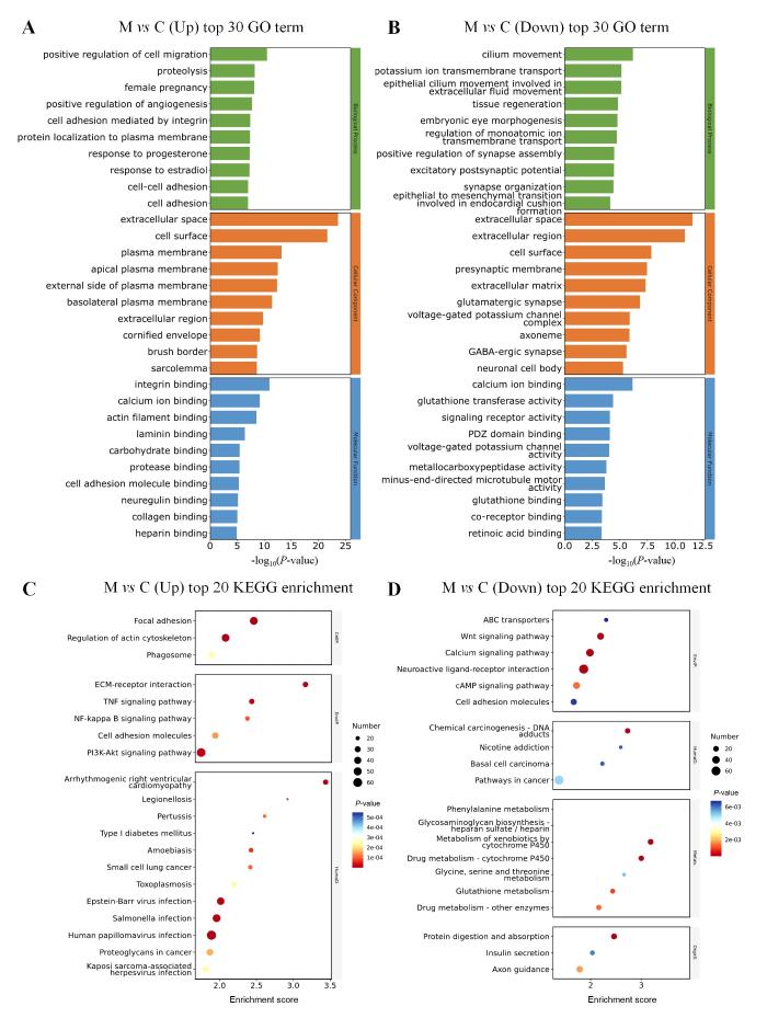 GO功能分析结果显示,表达上调的差异表达基因与细胞黏附、细胞通信、蛋白质定位、细胞迁移、细胞外基质相互作用相关;最显著相关的生物学过程包括细胞黏附、细胞-细胞黏附、对雌二醇的反应等,还有正向调节细胞迁移、正向调节血管生成等;最显著相关的细胞组分包括细胞表面和细胞外基质;最显著的分子功能涉及碳水化合物结合、胶原蛋白结合、肝素结合等(图6A)。表达下调的差异表达基因与细胞分化、突触功能、离子运输、细胞骨架运动以及细胞外基质的组成和功能相关;最显著相关的生物学过程包括上皮到间充质转变、参与心内膜垫形成等细胞分化和组织发育,还有突触组织、兴奋性突触后电位、突触组装的正向调节等神经系统功能;最显著相关的细胞组分包括细胞表面和细胞外基质;最显著的分子功能涉及离子通道和信号转导相关的电压门控钾通道活性和谷氨酸受体活性等(图6B)。