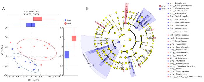 db/db小鼠及db/m小鼠口腔菌群结构的PCoA分析和 LEfSe分析