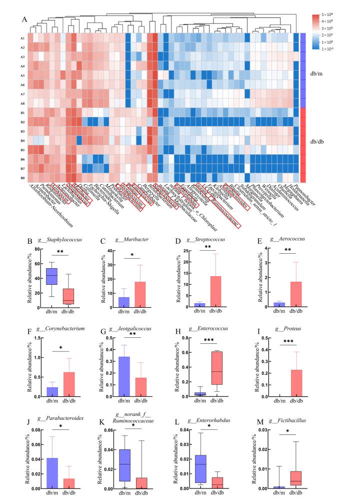 在db/db小鼠中,变形菌门(p_Proteobacteria)、变形菌纲(c_Gammaproteobacteria)、巴斯德氏菌目(o_Pasteurellales)、乳杆菌目(o_Lactobacillales)、棒杆菌目(o_Corynebacteriales)、摩根菌科(f_Morganellaceae)、巴斯德杆菌科(f_Pasteurellaceae)、气球菌科(f_Aerococcaceae)、链球菌科(f_Streptococcaceae)、肠球菌科(f_Enterococcaceae)、棒状杆菌科(f_Corynebacteriaceae)、鼠杆菌属(g_Muribacter)、变形杆菌属(g_Proteus)、棒状杆菌属(g_Corynebacterium)、肠球菌属(g_Enterococcus)、链球菌属(g_Streptococcus)、气球菌属(g_Aerococcus)、假芽孢杆菌属(g_Fictibacillus)富集。而db/m小鼠富集了葡萄球菌目(o_Staphylococcales)、葡萄球菌科(f_Staphylococcaceae)、坦纳菌科(f_Tannerellaceae)、副拟杆菌属(g_Parabacteroides)、嗜冷咸海鲜球菌属(g_Jeotgalicoccus)、葡萄球菌属(g_Staphylococcus)、颤螺旋菌科下未分类属(g_unclassified_f_Oscillospiraceae)、瘤胃球菌科下未分类属(g_norank_f_Ruminococcaceae)、肠杆菌属(g_Enterorhabdus)、考拉杆菌属(g_Phascolarctobacterium)。