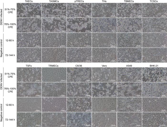 在DENV接种后观察的6 d(144 h)内,所有细胞均出现光学显微镜下可分辨的细胞病变,出现CPE的时间见表1。TSFs产生可分辨病变的时间最早,为感染后24 h;4种树鼩细胞TAECs、TASMCs、THs、pTRECs以及C6/36均于感染36 h出现病变;TCSCs以及2种常用细胞BHK-21、A549于感染48 h出现病变;TBMECs和Vero于感染60 h出现病变;而树鼩细胞TRMECs的病变始终不明显。