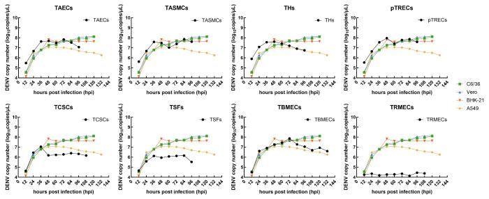Viral proliferation curves of tree shrew cells of different tissues after dengue virus (DENV) infection via real-time fluorescent quatitative PCR