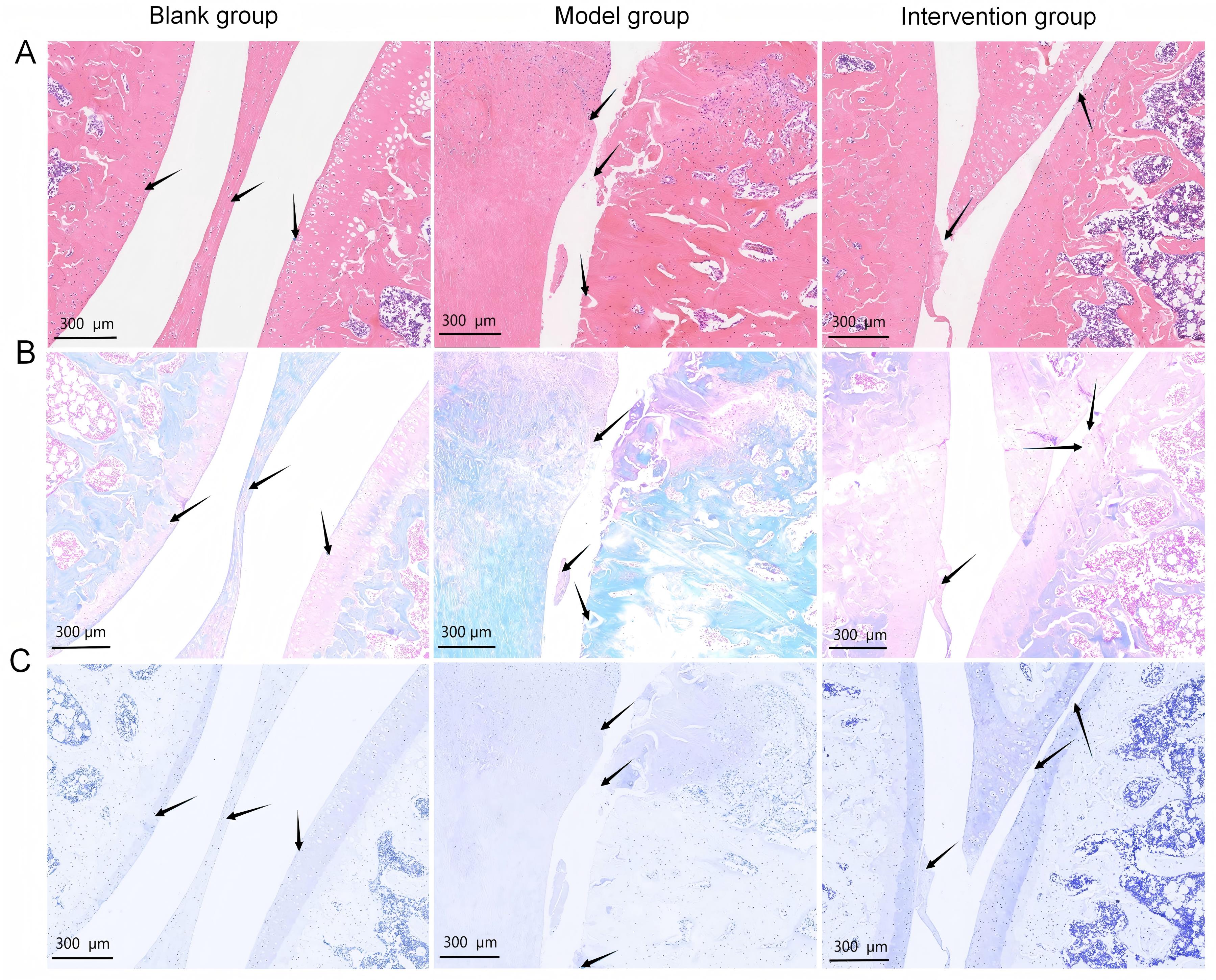 Figure 1 Histopathological changes in rat knee joint cartilage after monosodium iodoacetate injection and fraxetin intervention Note: A, B, and C are the staining results of hematoxylin-eosin, safranin O–fast green, and toluidine blue in the knee cartilage tissue of three groups of rats (scale bar = 300 μm, the black arrow in the picture points to the surface of the knee cartilage). The blank group refers to rats that were first injected with 50 μL of normal saline into the right knee joint cavity, followed by intra-articular injections of 50 μL of normal saline for 7 consecutive days; the model group refers to rats that were injected with one time injection of 50 μL fresh prepared monosodium iodoacetate (60 mg/mL)in the right knee joint cavity to induce osteoarthritis, followed by injections of 50 μL of normal saline for 7 consecutive days; the intervention group refers to rats that were injected with one time injection of 50 μL fresh prepared monosodium iodoacetate (60 mg/mL)in the right knee joint cavity, followed by fraxetin injections (5 mg·kg-1·d-1, dissolved in 50 μL of normal saline) for 7 consecutive days.