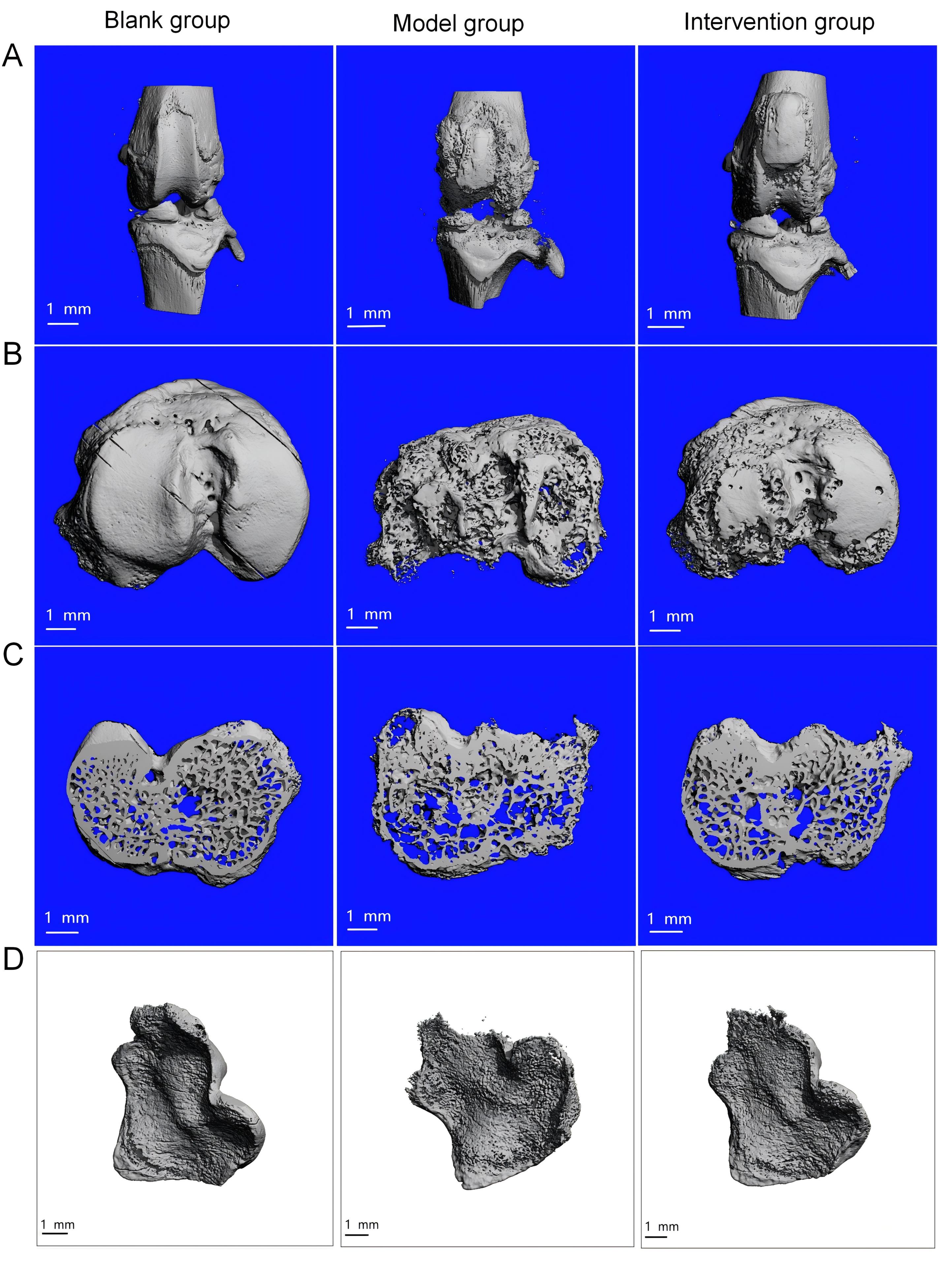 Figure 2 Micro-CT imaging of the rat knee joint after monosodium iodoacetate injection and fraxetin treatment Note: A, B, C, and D represent micro-CT images of the knee joints of three groups of rats, scanned at the levels of 3D reconstruction, the tibial platform, the subchondral bone, and specific cross-sectional regions, to assess bone structure and evaluate osteoarthritis changes. The blank group refers to rats that were first injected with 50 μL of normal saline into the right knee joint cavity, followed by intra-articular injections of 50 μL of normal saline for 7 consecutive days; the model group refers to rats that were injected with one time injection of 50 μL fresh prepared monosodium iodoacetate (60 mg/mL)in the right knee joint cavity to induce osteoarthritis, followed by injection of 50 μL of normal saline for 7 consecutive days; the intervention group refers to rats that were injected with one time injection of 50 μL fresh prepared monosodium iodoacetate (60 mg/mL)in the right knee joint cavity, followed by intra-articular injections of fraxetin (5 mg·kg-1·d-1, dissolved in 50 μL of normal saline) for 7 consecutive days.