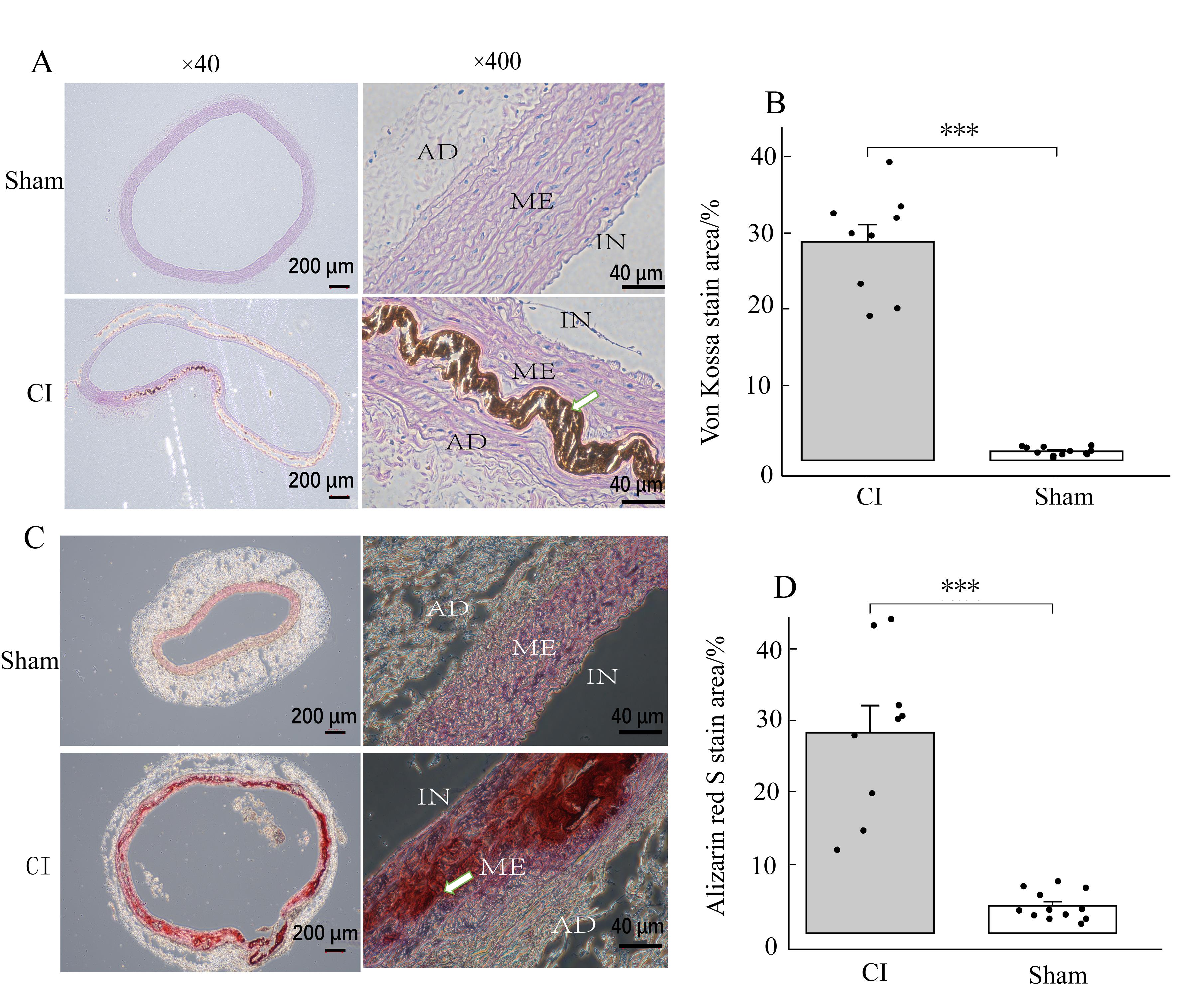 图4 实验组和对照组大鼠的主动脉von Kossa染色及茜素红S染色观察 注:IN表示主动脉内膜;ME表示主动脉中膜;AD表示主动脉外膜。图A、B为von Kossa染色;图C、D为茜素红S染色。实验组(CI,n=9)的染色面积占比明显大于对照组(sham,n=12)(***P<0.001)。白色箭头处为高倍镜下动脉中膜钙化沉积。