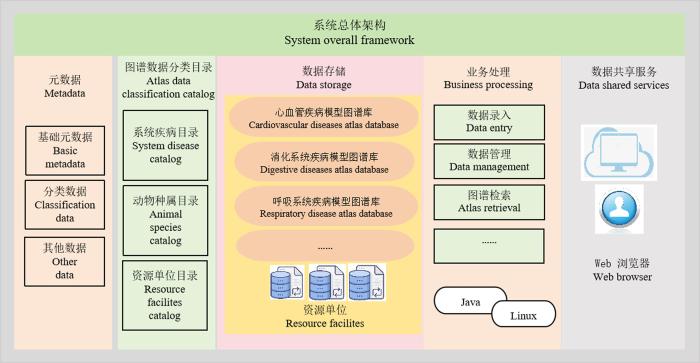 目前,国内外动物模型相关数据库主要以收集动物模型资源的基础数据为主,或只对动物模型的系统组织图谱等进行局部性分析。例如:Aigner等[7]研究了动物模型系统组织病理学图谱的指导原则,为动物模型研究结果的评估提供指导;Li等[8]通过肺炎模型的动物肺部免疫图谱分析了细菌性肺炎的免疫反应情况。2020年,在科技部的部署下,中国医学科学院医学实验动物研究所建立了国家动物模型资源共享信息平台,为重大传染病疫情攻关以及生命科学研究所需的动物模型资源开发提供了重要的数据支撑。目前,该平台收集的动物模型信息以动物模型名称、表型数据、模型评价与验证、制备方法以及动物属性等数据为主[9]。黄红坤等[10]、吴玥等[11]先后建立了人类疾病动物模型资源数据库、冠状病毒感染动物模型比较转录组学数据库,前者主要是收录动物属性、模型制备、供应单位、文献等相关信息[10];后者侧重收录的是感染动物模型与人类的转录组数据[11]。此外,在传统书籍出版方面,中国农业大学赵德明等[12]拟出版《实验动物模型组织病理学图谱》;刘江伟等[13]出版了《急进高原环境组织病理学实验图谱》。纸质版书籍阅读性强,如果转化为数字化图谱将有助于扩大图谱资源覆盖面,极大提升共享效率。