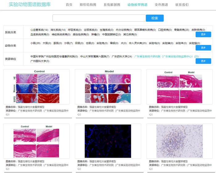 数据库平台主要通过两种检索方式让用户快速获得所需的模型图谱资源:一种方式是在首页的二级页面的检索栏中,用户输入关键词进行模糊检索,如输入动物模型名称“脊柱炎”则会呈现出图谱标题名称中带有“脊柱炎”关键词的图谱缩略图及相应的信息;另一种方式则是通过系统疾病、动物种属、资源单位3个维度的分类筛选条件快速检索图谱数据,也可以采用布尔逻辑方法对这3个维度进行并列条件以及单一条件检索,如在首页中系统疾病分类选择“骨骼疾病”,动物种属选择“非人灵长类”,资源单位选择“广东省生物技术研究院(广东省实验动物监测中心)”,则呈现出目前平台已有的25个“强直性脊柱炎食蟹猴模型”图谱数据,从而实现快速精确检索。
