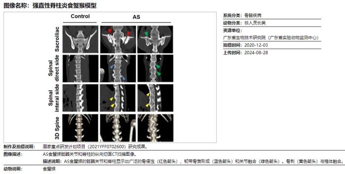 骨骼系统疾病 Musculoskeletal disorders | 强直性脊柱炎食蟹猴模型 | 25 | 250 | 广东省生物技术研究院(广东省实验动物监测中心) |